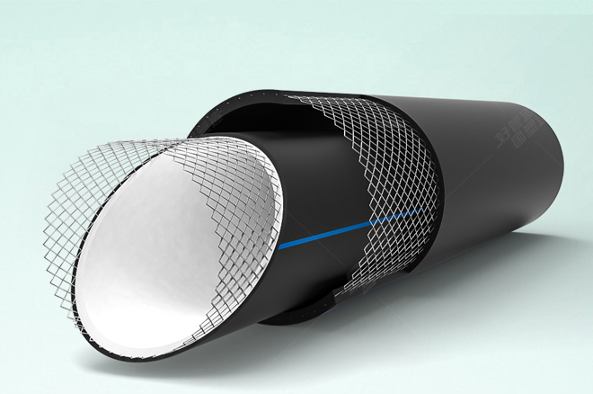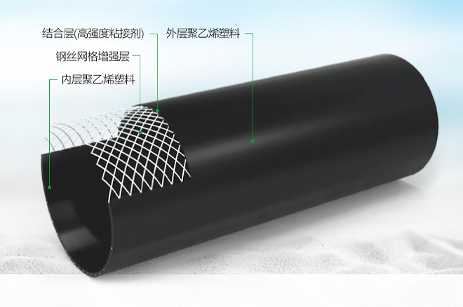 鋼絲網骨架聚乙烯復合管是以高強度鋼絲左右螺旋纏繞成型的網狀骨架為增強體, 以高密度聚乙烯(HDPE)為基體,并用高性能的HDPE改性粘結樹脂將鋼絲骨架與內、外層高密度聚乙烯緊密地連接在一起的一種新型管材。 因為高強度鋼絲增強體被包覆在連續熱塑性塑料之中,因此鋼絲網骨架聚乙烯復合管克服了鋼管和塑料管各自的缺點, 而又保持了鋼管和塑料管各自的優點。鋼絲網骨架聚乙烯復合管,采用了優質的材質和先進的生產工藝,使之具有更高的耐壓性能。 同時,該復合管具有優良的柔性,適用于長距離埋地用供水、輸氣管道系統。